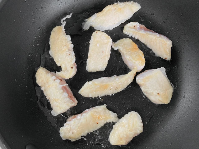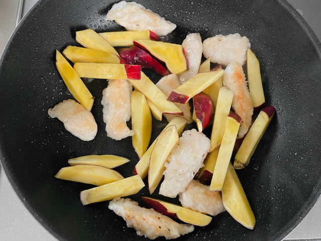 鶏ささみに火が通ったらさつまいもを加えて、全体に油がなじむまで炒めます。