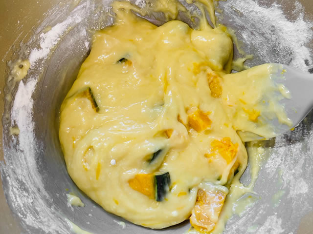 ボウルに卵、砂糖、サラダ油、ホットケーキミックスを混ぜ、飾り用以外のかぼちゃを入れて軽く混ぜ合わせます。