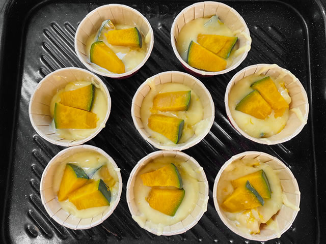 カップケーキ容器8個に分けて入れ、飾り用に取っておいたかぼちゃを2個ずつトッピングします。