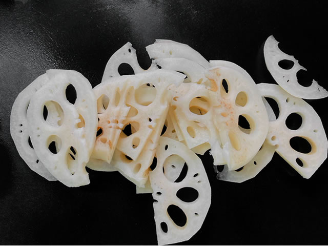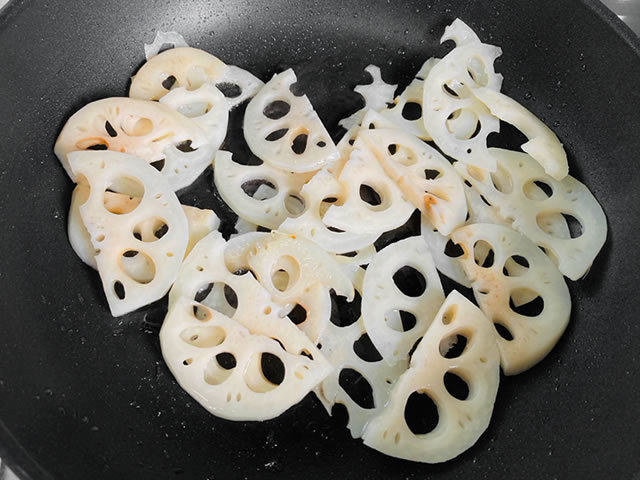 フライパンを温めサラダ油を引いてレンコンを炒めます。
