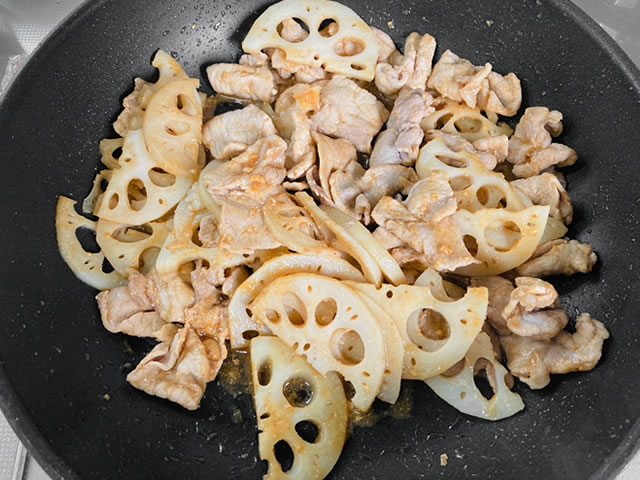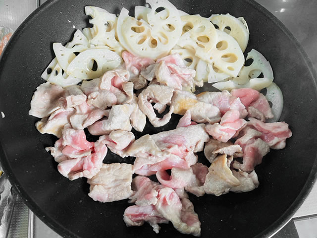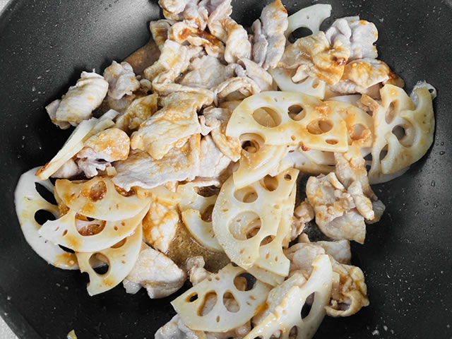 レンコンが透き通ってきたら、豚肉を加えて炒めます。