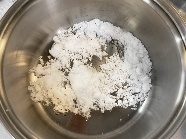 鍋またはフライパンに砂糖60gを入れ、水大さじ1をかけてなじませ(かき混ぜないでくださいね)、強めの中火でそのまま砂糖が溶けて大きな泡が立つまで加熱します。