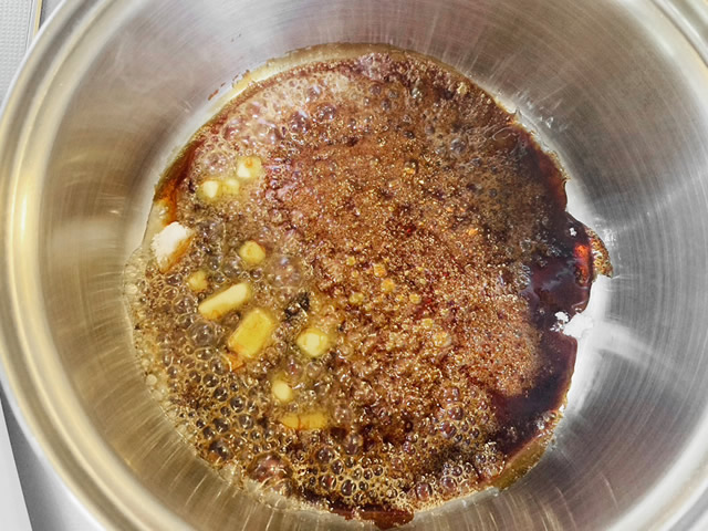 周囲が茶色く色づいたら弱めの中火にし、フライパンを回しながら全体が茶色くなるまで煮詰めた後、バターを入れます。