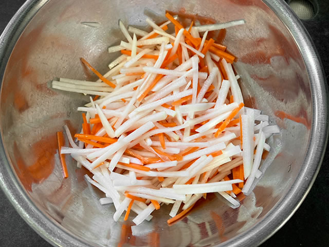大根、人参は千切りにして塩を振り、しんなりするまで置きます。
