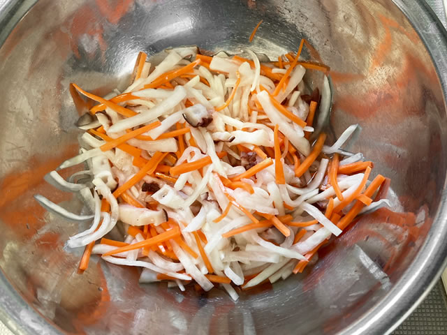 大根、人参の水分をしっかりと絞ったら、タコと合わせ酢を入れて和えます。