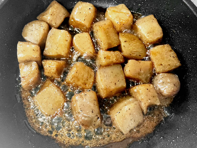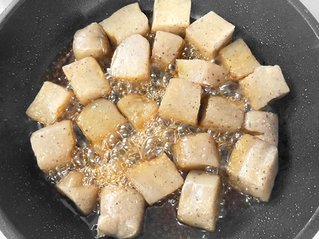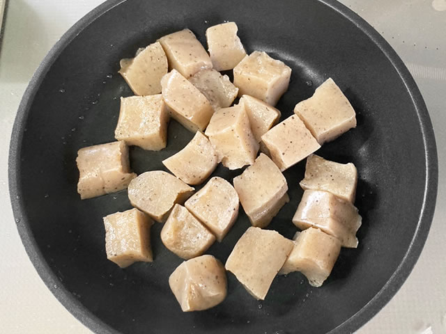 フライパンに油を引かずに中火で下茹でしたこんにゃくを転がしながら1分ほど乾煎りして、こんにゃくの水分や臭みをさらに飛ばします。