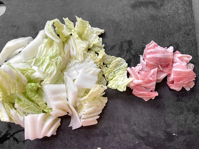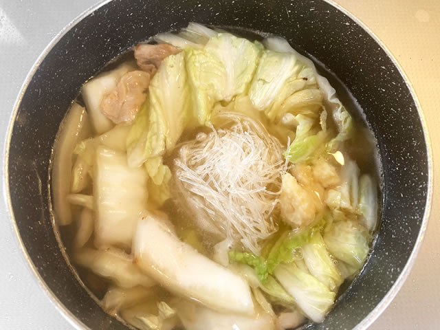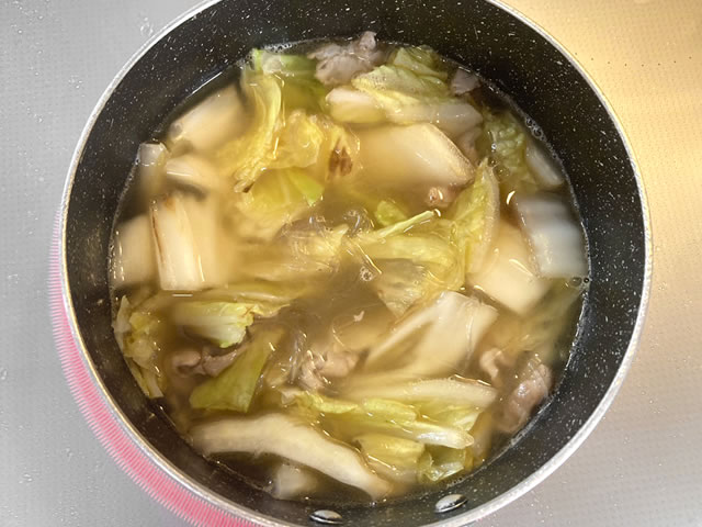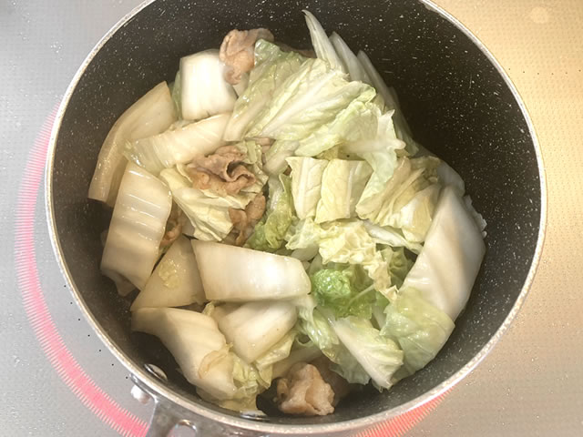 白菜のかさが少し減ったら、水500cc加えて強火で沸騰させます。