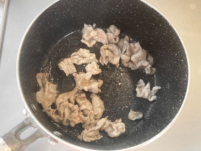 鍋を温めてごま油をひいて豚肉を炒めます。