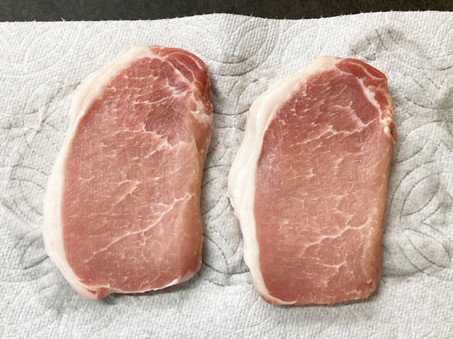 キッチンペーパーの上に豚肉を置き、上からもキッチンペーパーを乗せて抑えます。