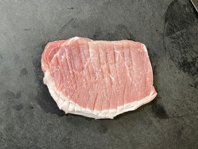 豚肉は脂身のところを筋切りし、包丁の背で軽く叩きます。