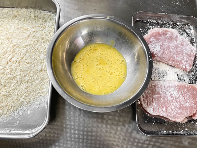 薄力粉、とき卵、パン粉をそれぞれ容器に入れて準備し、お肉を薄力粉⇒卵⇒パン粉の順につけます。