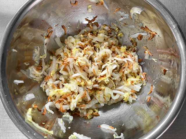 白菜は5ミリ幅に千切りにしてボウルに入れ、塩少々を加えてまぶし、10分程置き、桜エビは表面がパリッとするまで弱火で乾煎りしておきます。