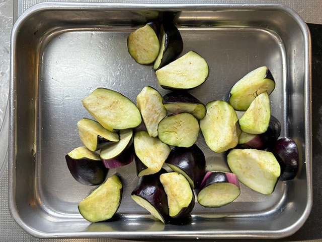 ナスは乱切りにし、塩を振って水分を出します。ナスから水分が出てきたら、軽く絞ってペーパータオルなどでよく拭き取ります。