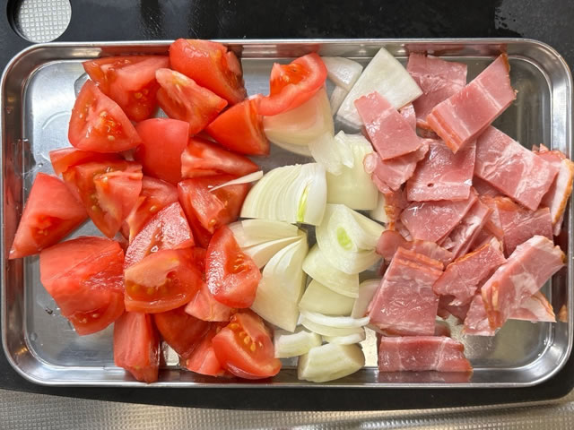 トマト、玉ねぎ、ベーコンは食べやすい大きさに切っておきましょう。