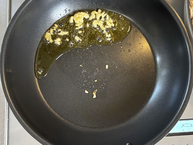 フライパンに油とみじん切りのにんにくを入れたら火をつけます。