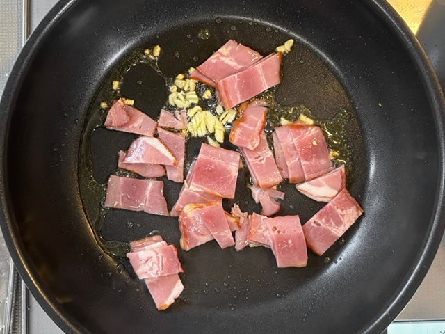 にんにくの香りがしてきたら、ベーコンを炒めます。