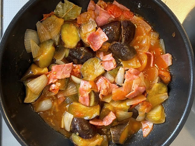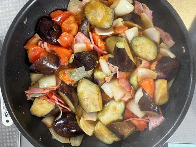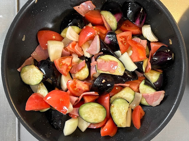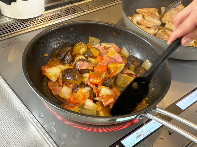ベーコンに火が通ったらナス、玉ねぎ、トマトを炒めます。