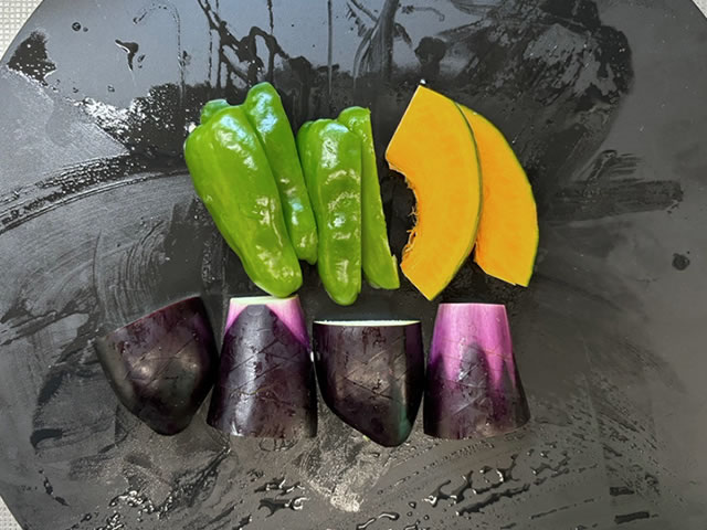 ナスは縦半分をさらに半分にして斜めに切れ目を入れ、ピーマンも縦に4等分、かぼちゃは食べやすい薄切りにします。