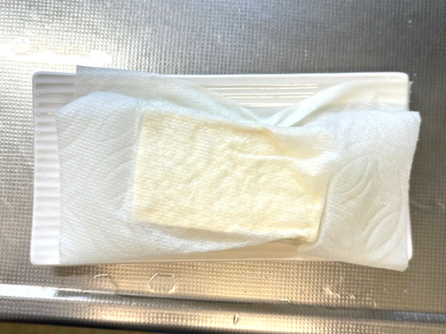 豆腐はキッチンペーパーに包み、電子レンジ600wで3分加熱して水切りします。