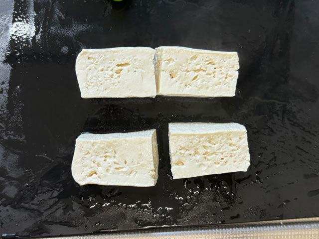豆腐を切ったとき、写真のようにちょっと穴が空いていればオッケーです。4等分に切っておきます。