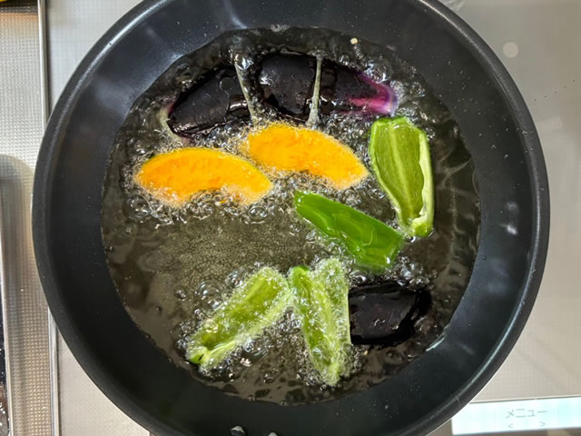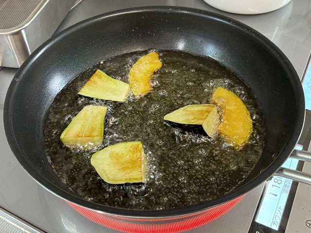 ナスとかぼちゃもほんのり焼き色が付くまで揚げましょう。