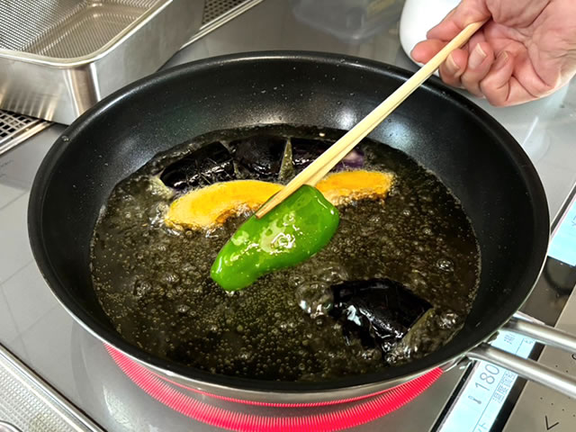 まずは野菜の素揚げから。フライパンを温めて鍋底から3センチほどの油を入れ、180℃で揚げます。