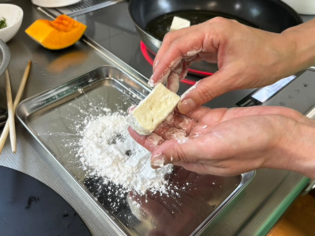 次に、水切りした豆腐に片栗粉を薄くまぶして、余分な片栗粉をはらい落とし、油に入れていきます。