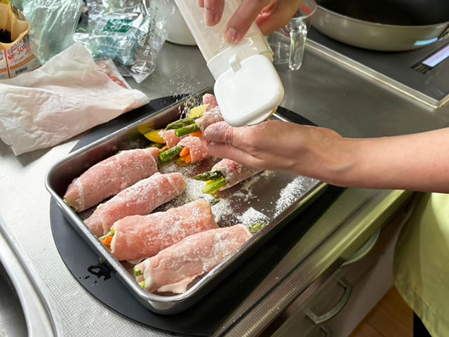 薄力粉を肉巻きひとつひとつにまぶしていきます。