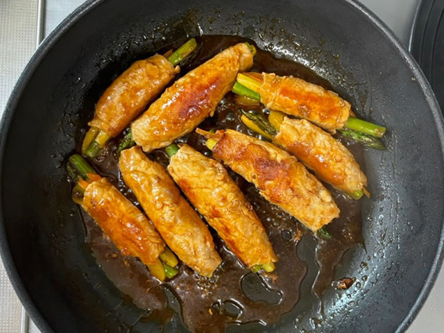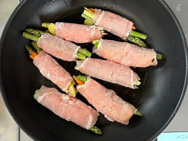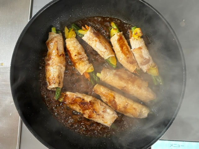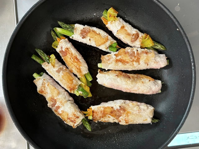 フライパンを温め、油をひき、肉巻きは巻き終わりを下にして焼きます。