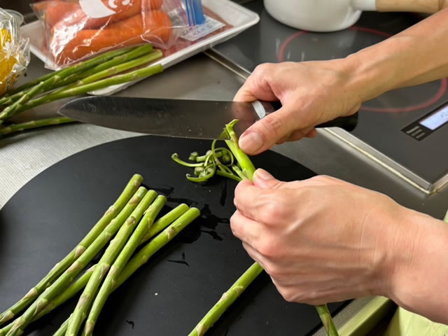 根元を1cmほど切り落とし、根元から3cmくらいの固いところの皮を剥きます。ピーラーを使うと簡単ですよ☆