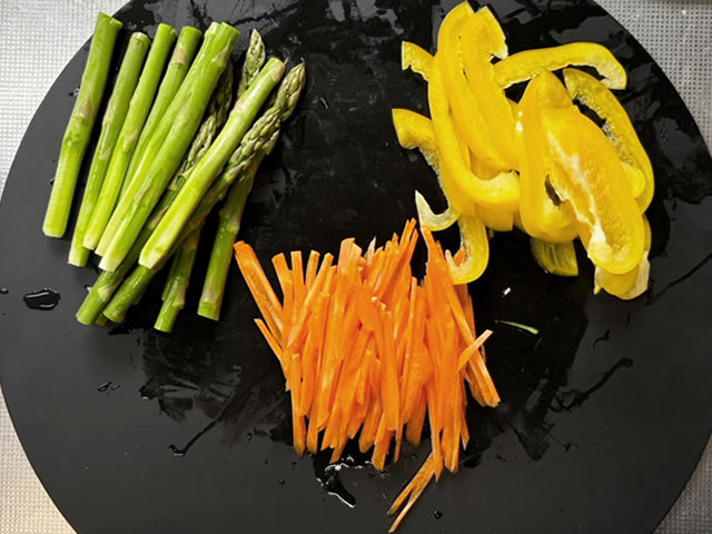 アスパラは半分に切り、にんじんは千切り、パプリカは薄くスライスします。