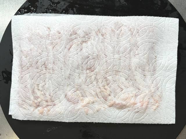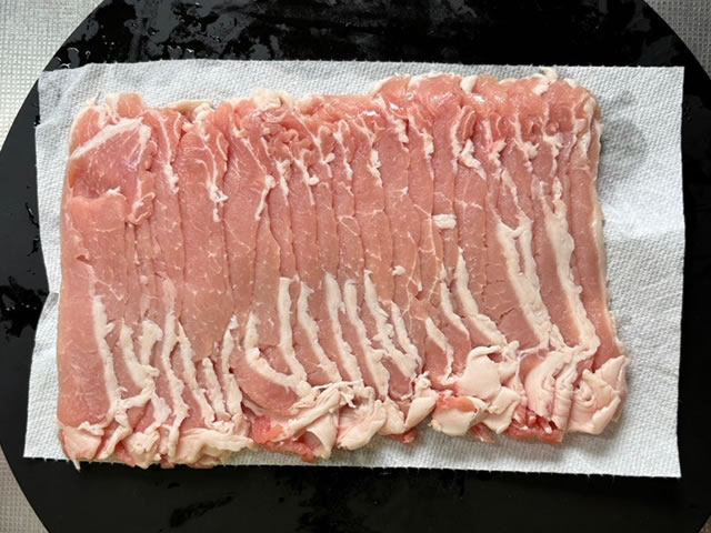 上からもキッチンペーパーを乗せ、軽く押さえて豚肉のドリップを取り除きます。