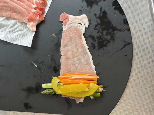 豚ロース1枚を縦に置き、手前に野菜を置きます。量はお好みで☆