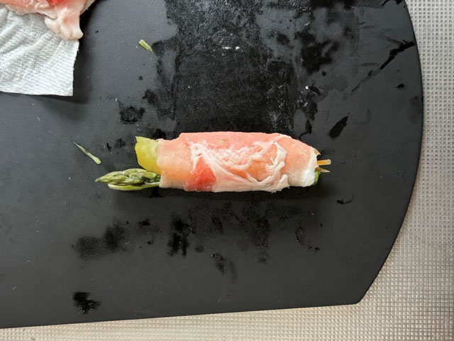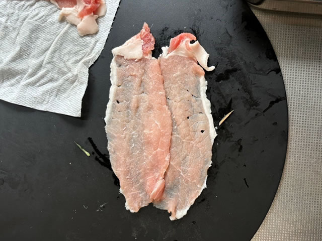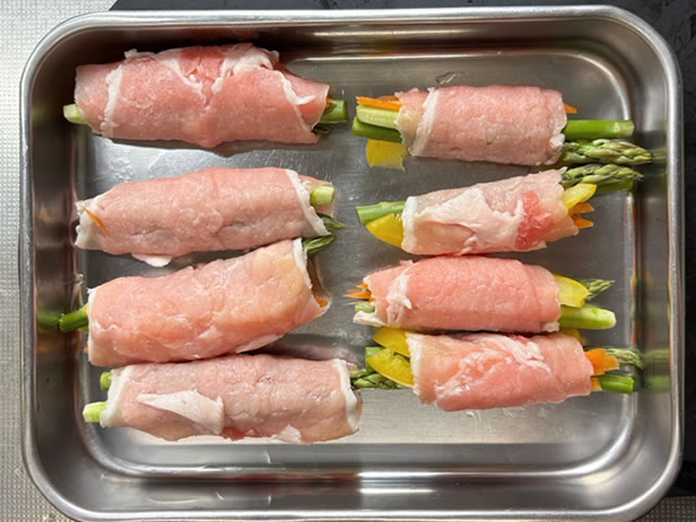 左側は豚ロース2枚で巻いたもの、右側が豚ロース1枚で巻いたものです。結構ボリューム感が違いますね!