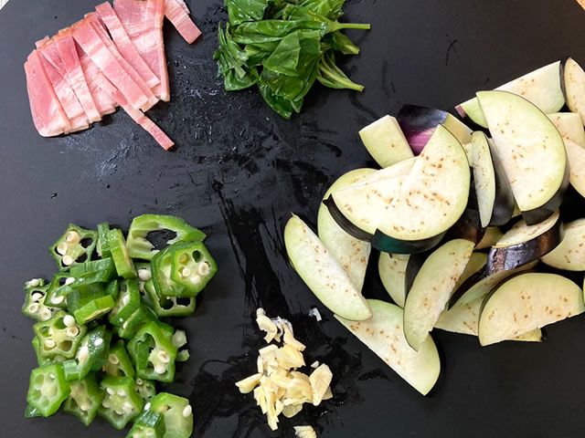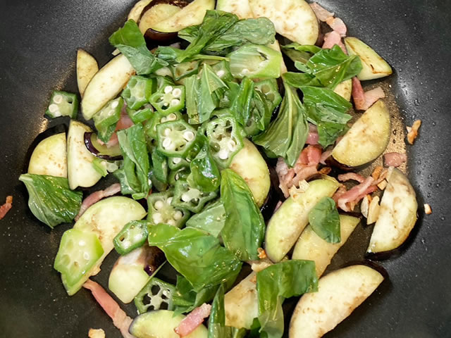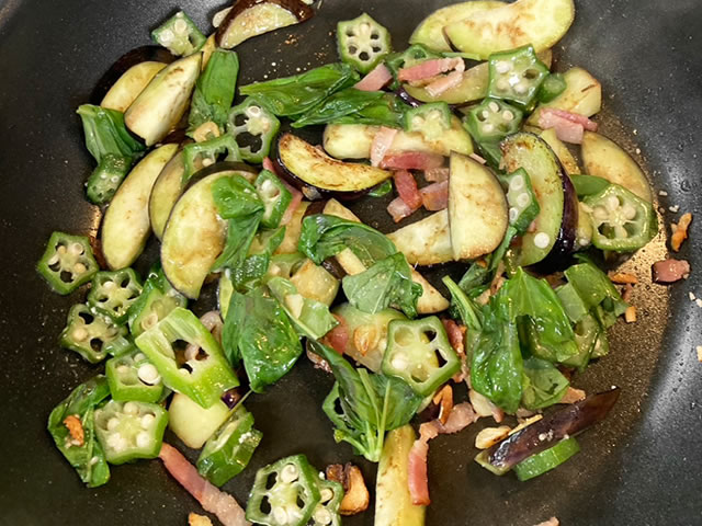 ナスとベーコン、オクラを炒めるだけの簡単副菜!