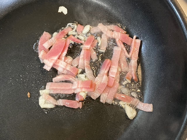 フライパンに油を入れて熱し、にんにくとベーコンを入れて香りが出るまで炒めます。