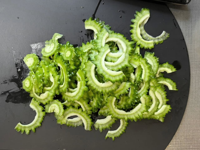 サッと茹でるだけなので、ゴーヤチャンプルのときよりもちょっと薄く2~3ミリに切るようにしましょう。