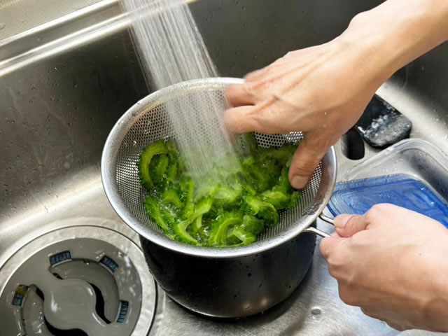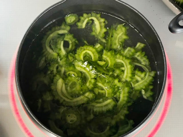 鍋などにお湯を沸かし、30秒ほどゴーヤを茹でます。