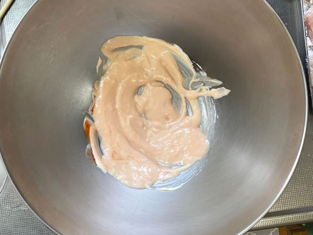 はじめに混ぜ合わせたソースに揚げた鶏むね肉を入れて、混ぜ合わせます。