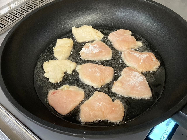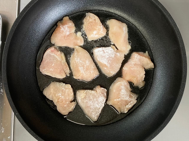 フライパンに大さじ3の油をひいて火をつけたらすぐに鶏むね肉を入れていきます。