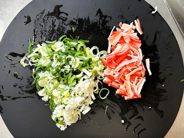 カニカマは軽くほぐして、長ネギは刻んでおきます。
