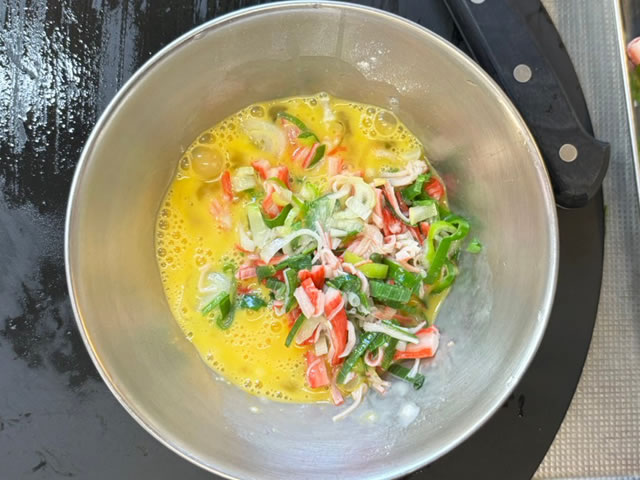 溶き卵にさきほど炒めたカニカマと長ねぎを半量ずつ入れ、片栗粉(小さじ1/2)、みりんも(小さじ1)入れ、よくかき混ぜます。