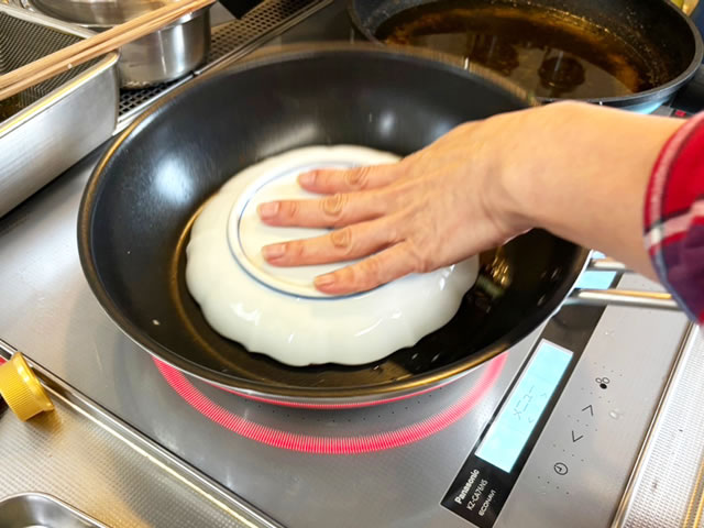 丸く整えたたまごにお皿をかぶせて…