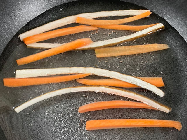 いんげんはヘタを切り落とし、フライパンにお湯を沸かしたら、ごぼう、にんじん、いんげんを5分ほど下茹でし、茹であがったら粗熱を取ります。
