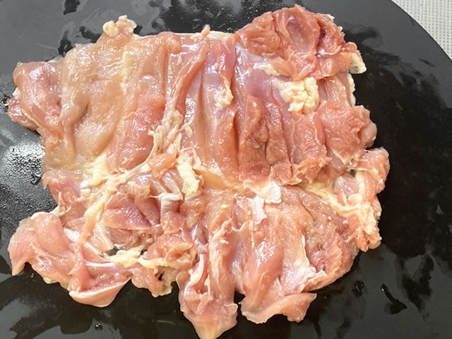 鶏肉は厚さが均一になるよう切り込みを入れて開きます。