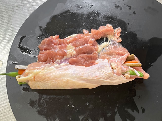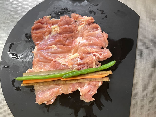 ごぼう、にんじん、いんげんを鶏肉の幅に合わせて乗せます。