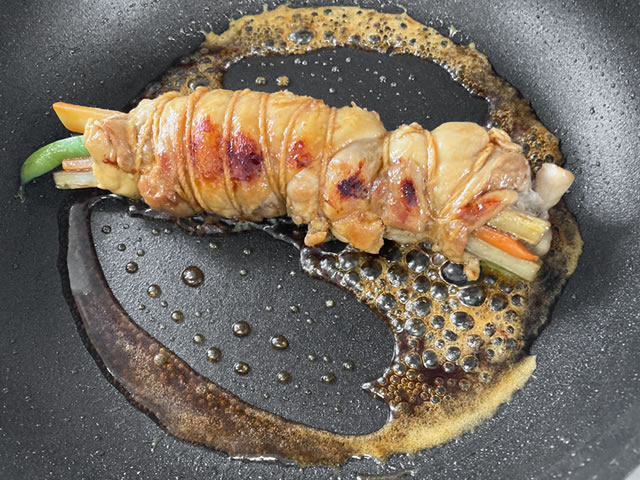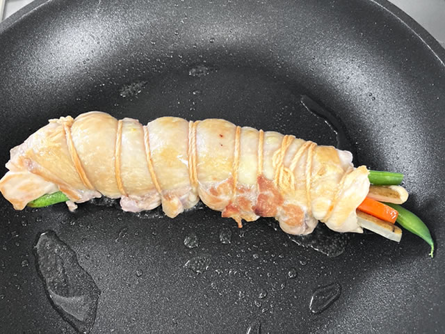 フライパンにサラダ油を入れて熱し、鶏肉の巻き終わりを下にして入れ、焼き色がつくまで転がしながら中火で焼きます。
