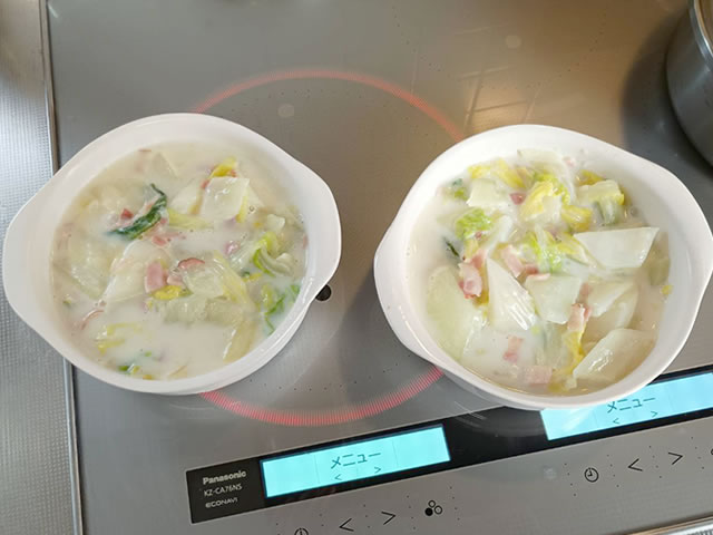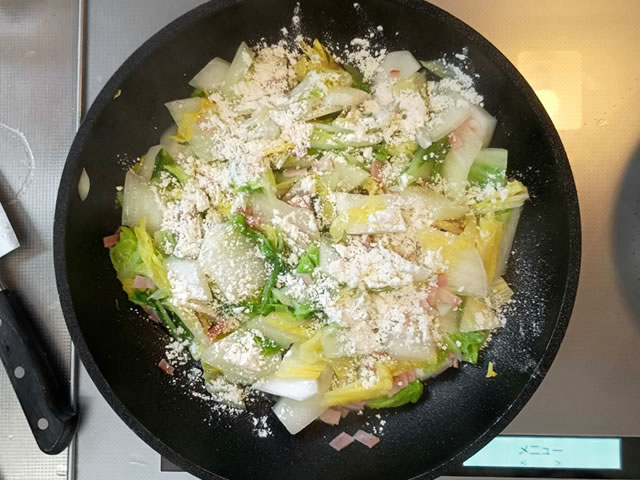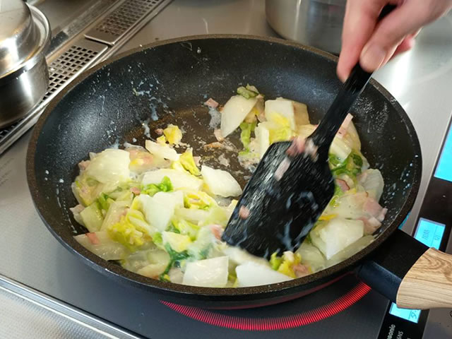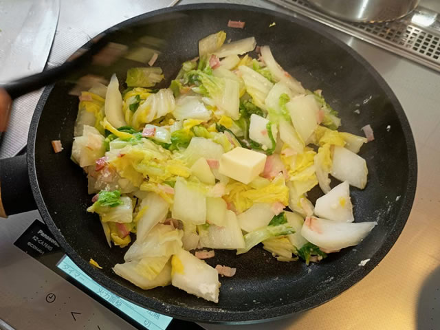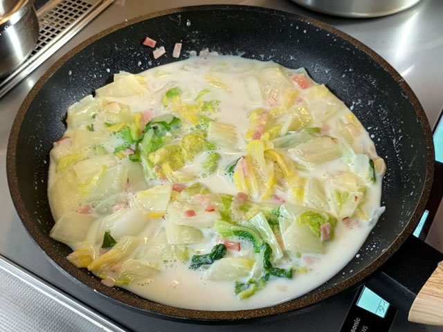 白菜とベーコンを炒めて、薄力粉とバター、牛乳を加えたら準備オッケー!