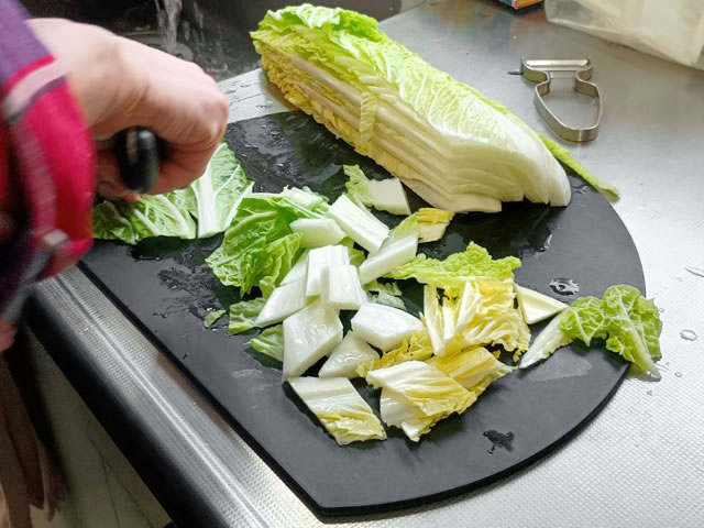 白菜を一口大くらいの大きさに切ります。芯の部分は硬いので少し小さめに切ります。