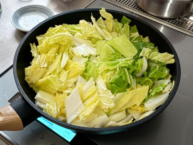 フライパンにオリーブオイルを引き、白菜を入れ、しばらく動かさずに待ちましょう。白菜から水分がでてきたら軽く揺らす程度にし、5分くらい炒めて白菜の芯の部分から水分が抜けてきてしなっとなるまで火を通します。